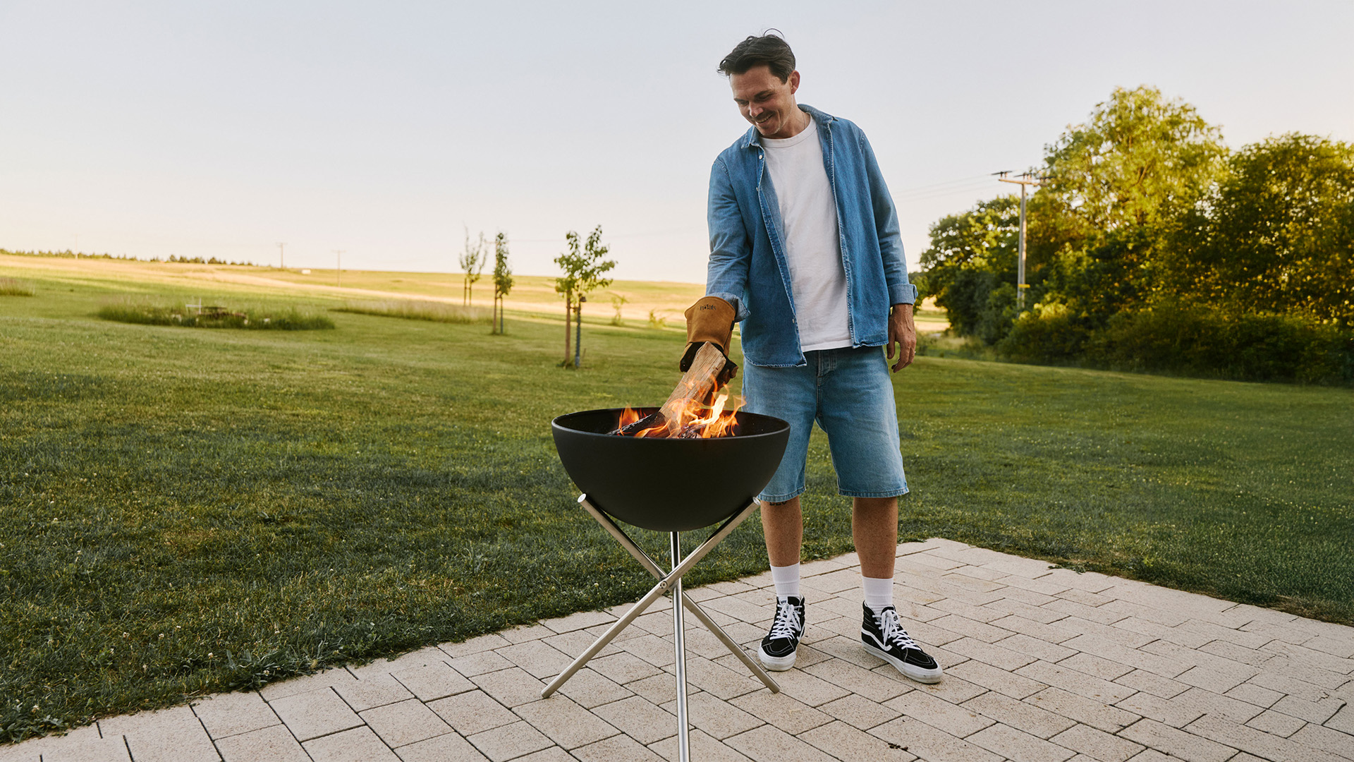 The black steel hemisphere sits securely on either the low star base or the hip-height tripod. In a horizontal position, the BOWL offers plenty of space for friends and food. Tilted, it protects the flames from wind and reflects heat precisely where you want it.